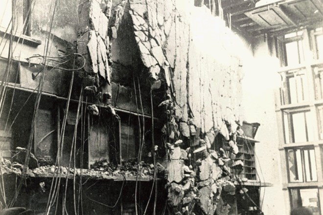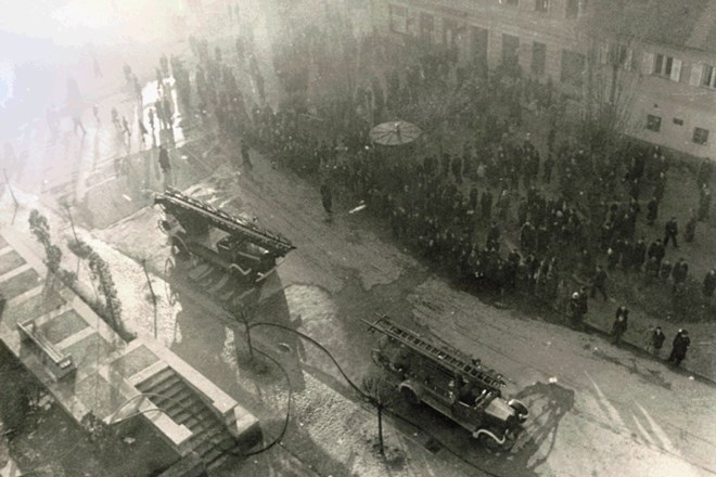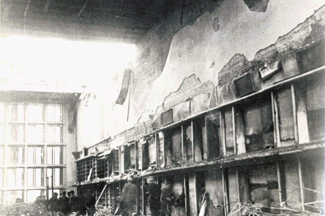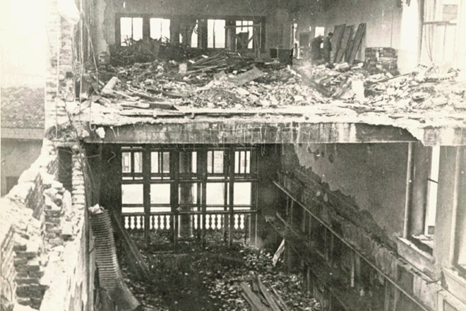 Letalo je predrlo streho nad čitalnico ob Gosposki ulici, zdrselo po vsej dvorani in se ustavilo pri stekleni steni ob Vegovi ulici. Gorivo je eksplodiralo in v požaru je zgorelo več deset tisoč knjig. Pripovedovali so, da je  mojster Plečnik, ko je slišal, da gori velika čitalnica, rekel: “Bodite brez skrbi; stavba je tako zgrajena, da se požar ne bo razširil!”