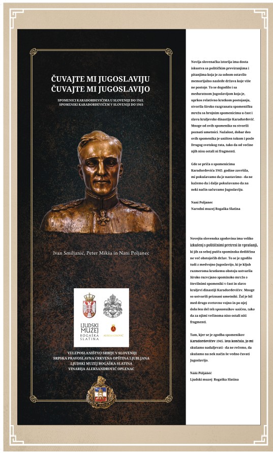 Postavitev, ki sta jo pripravila Ambasada Republike Srbije v Sloveniji in Ljudski muzej Rogaška Slatina, odpira vprašanje spominske dediščine medvojne Jugoslavije na Slovenskem. V razmeroma kratkem času med obema vojnama je nastala razvejana mreža figuralnih spomenikov, posvečenih dinastiji Karađorđević. Ti niso bili le umetniški objekti, temveč tudi del jasno oblikovanega političnega prostora. Večina jih je bila med drugo svetovno vojno in po njej odstranjena ali uničena, zato danes o njih pogosto pričajo predvsem arhivski viri.