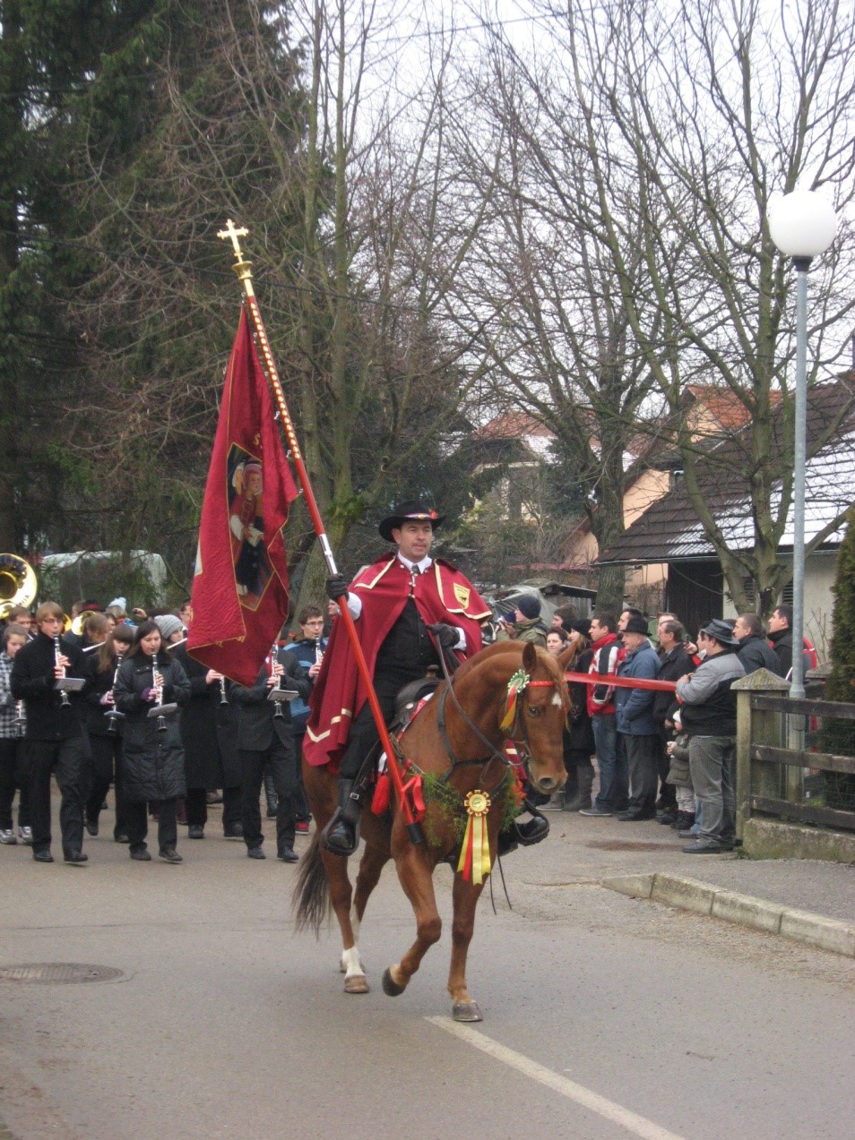 Podoben, a vendar drugačen je potek blagoslova konj pri cerkvi, saj se je obrnil vrstni red svete maše in blagoslova. Blagoslov je sedaj izveden prvi. Procesijo sta prej vodila g. Lampe ali g. Šebala, opremljena v obleki generala. Kasneje je znano, da so imeli pripasano sabljo in bili opremljeni z gasilsko kapo na glavi. Včasih so jahali belega konja in imeli na glavi papirnato ”čako” s perjem, ki je spominjala na pokrivala nekdanjih avstrijskih generalov. Danes temu ni več tako. Od leta 1991 se izvaja nov običaj, kar pomeni, da procesijo ne vodi vedno isti konjenik, ampak se praporščaki menjajo. V devetdesetih letih 20. stoletja se je nekaj praporščakov pojavilo tudi v narodni noši, vendar se tradicija ni obdržala. Sama tradicija praporščakov sedaj traja 25 let. V letu 2015 je prapor prvič nosila ženska. Iskanje praporščakov je vsako leto težje, saj se število zaslužnih kandidatov in vaščanov, ki še niso dobili te časti, zmanjšuje. Kljub temu si člani odbora, ki izbirajo praporščake prizadevajo, da ta običaj ne bi šel v pozabo. Pri izbiri praporščakov predvsem upoštevajo povezavo te osebe s konji in ostalimi zaslugami, kot je pomoč pri PGD Dolenja Stara vas, ki je sedaj glavni organizator (skupaj z občino Šentjernej). V času, ko običaj še ni bilo potrebno posebej organizirati z raznih administrativnih strani, so za organizacijo poskrbeli sami vaščani. Tako običaj ni prekinilo niti slabo zasneženo vreme, saj so vaščani pred procesijo sami očistili ceste. Je pa v določenih letih že skoraj prišlo do prekinitve običaja. Razlog je bila takratnja italijanska okupacija med drugo svetovno vojno. Leta 1941 so se v procesijo podali zgolj trije mladeniči, stari 11 in 12 let, ki so bili še premladi, da bili vpoklicani v vojsko. To pa niso najmlajši konjeniki, zabeleženi v Štefanovi povorki. Leta 1992, se je povorke udeležil šestletnik, Gašper Penca, ki je jezdil na konju v očetovem naročju. Leta 1999 sta se povorke udeležila še dva mlajša člana. Prvi je bil petletni domačin, Julijan Frančič in triletni Žiga Zupančič z Rake, ki sta skupaj jezdila na poniju. Tako mlajši kot ostali starejši konjeniki običajno na glavi nosijo klobuk z zelenjem, lahko je okrašen tudi s petelinjim ali gosjim peresom ali pa zgolj z raznoraznimi barvnimi trakovi iz blaga. Mnogi si nadenejo škornje, nekaj pa je tudi tistih, ki si nadenejo prave jahalne hlače in čepice. Tudi konji so na ta dan zelo čisti in okrašeni. Lastniki jih na ta dan zelo lepo skrtačijo. Poleg lepe svetlikajoče dlake jih krasijo še zelenje (vejice asparagusa ali rožmarina), pisani barvni trakovi ter raznorazne kite na grivah konj in podvezani repi. Nekaterim grivo spletejo v kite in jih namočijo, da se lepo skodra in razpusti, druge krasijo kar kite same. V preteklosti konjeniki niso bili dovolj premožni, da bi si lahko privoščili sedla, med drugo svetovno vojno pa je še obstajala verjetnost, da bi jih vojaki zasegli za svoje potrebe. Tudi kasneje (osemdeseta 20. stoletja) so sedla predstavljala statusni simbol oz. premožnejši status konjenika. Drugi so kakor včasih imeli na konju plahto podvezano z vrvjo, da so prav tako lahko jezdili. V današnjih časih so v povorki le še redki, ki jezdijo konja brez sedla.